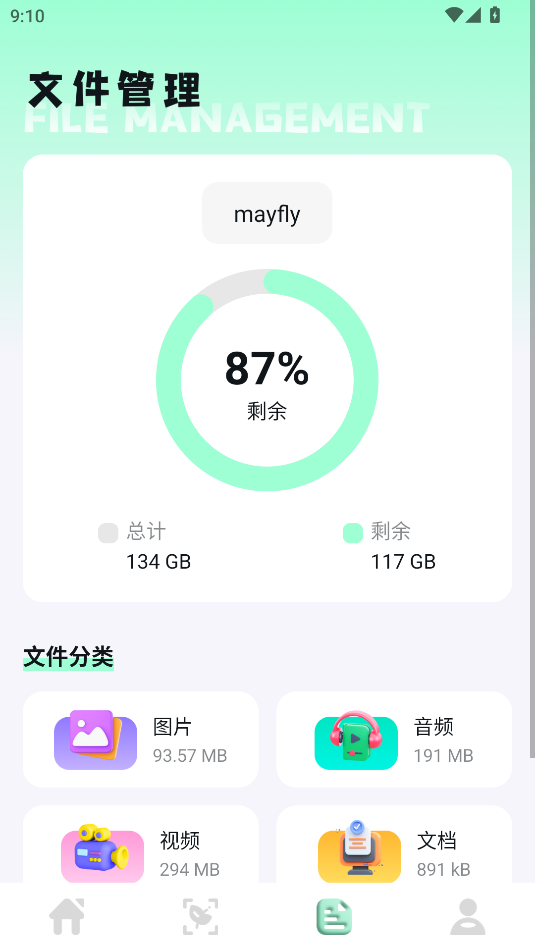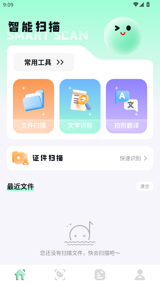 1、智能扫描界面提供了文件扫描、文字识别和拍照翻译功能