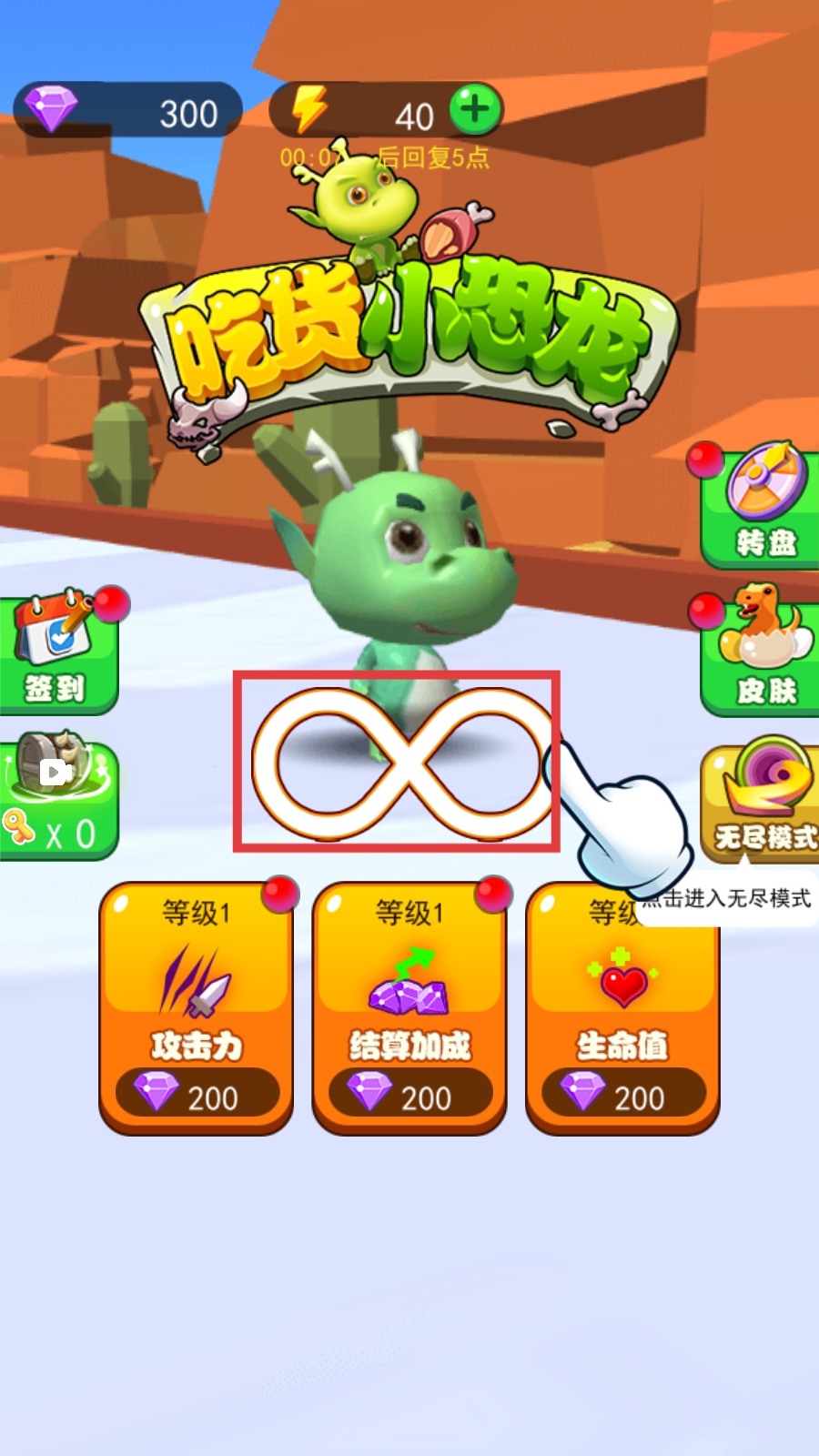 1、在《吃货小恐龙》主界面,点击【∞】标识开启游戏,优先消耗钻石升级【攻击力-等级1】增强战力。