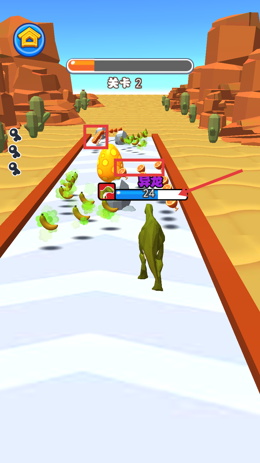 2、进入【关卡-2】后,收集香蕉、橙子等水果道具,靠近【异龙-24】时准备触发战斗机制推进流程。