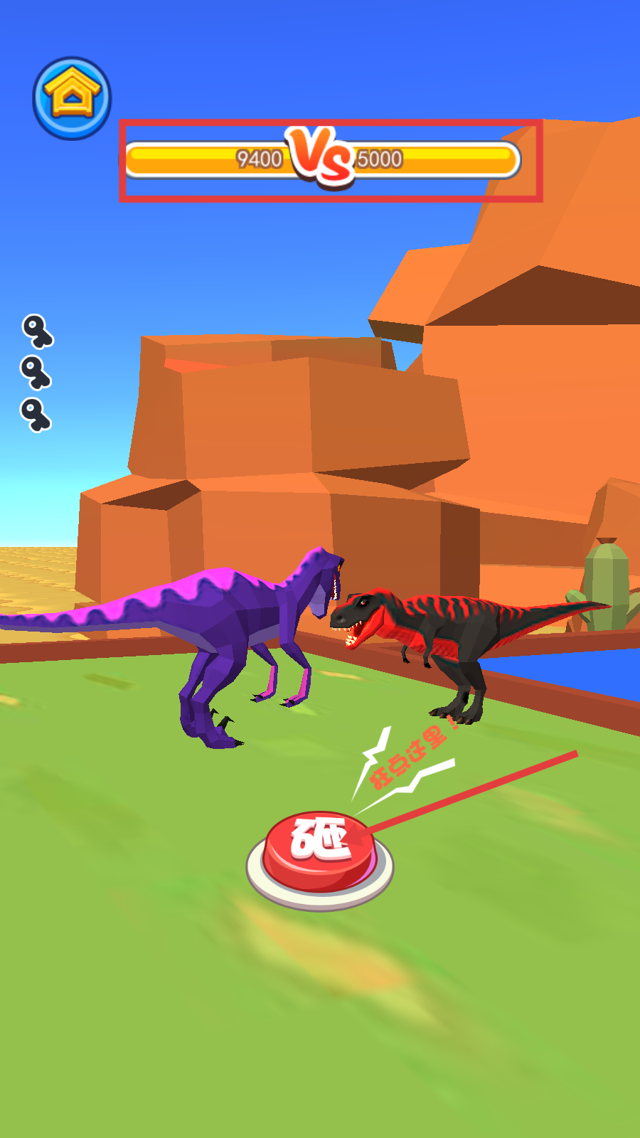 3、恐龙对战阶段,关注【9400-Vs-5000】战力条,快速点击红色【砸】按钮,借助战力优势击败对手。