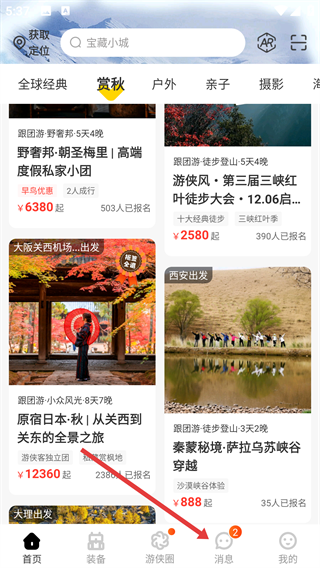 1、我们需要打开游侠客App,进入首页后点击底部的【消息】选项,进入消息页面呢。