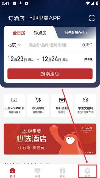 1、在界面底部找到【我的】按钮并点击,可从酒店预订页进入个人功能相关页面。