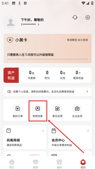 2、进入页面后,找到【常用住客】选项并点击,即可进入住客信息管理页面。