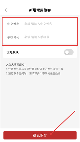 4、在新增页面填写【中文姓名】【手机号码】后,点击【确认保存】即可完成住客信息添加。