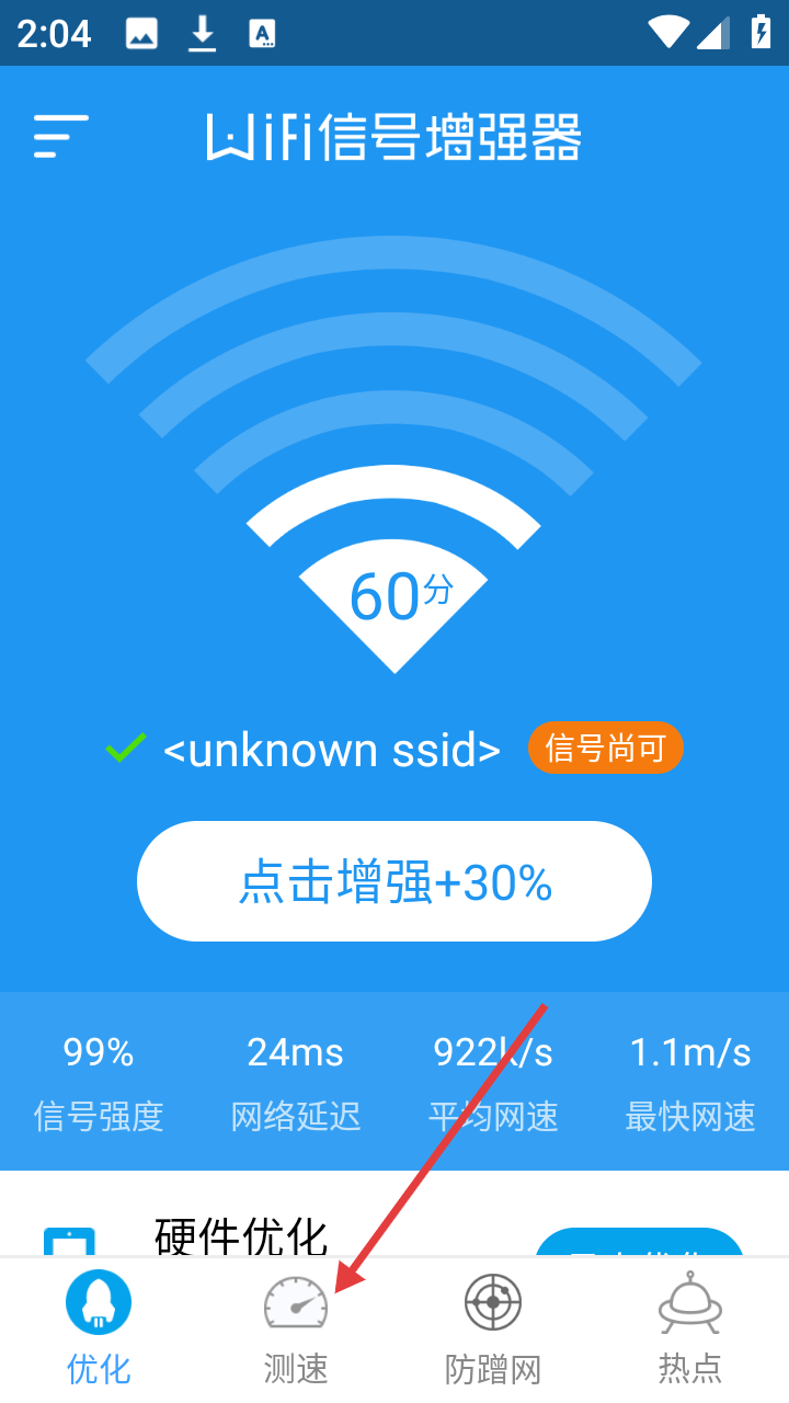 2、在WiFi信号增强器页面点击【测速】,进入测速页面。