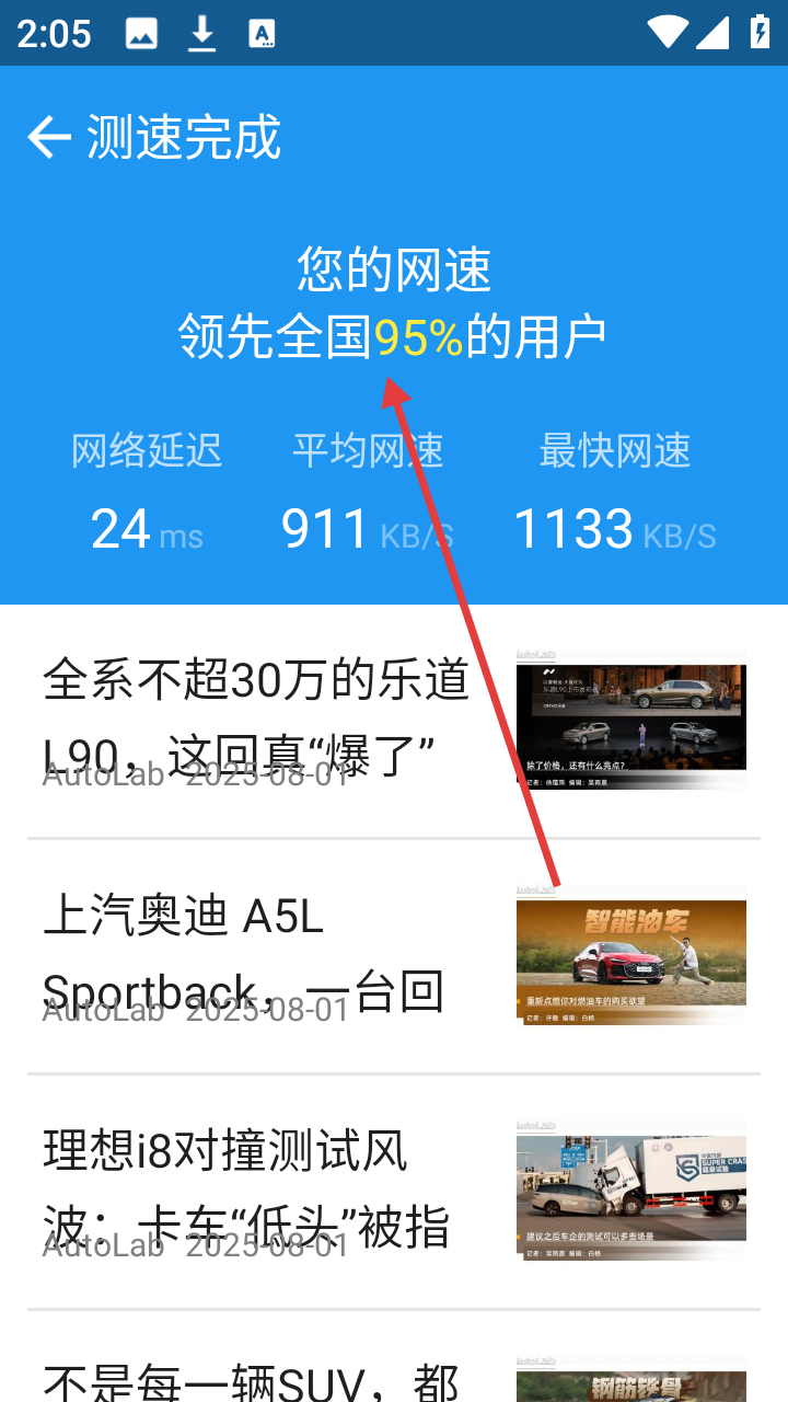 4、测速完成后即可【查看网速】,显示领先全国95%的用户等结果。