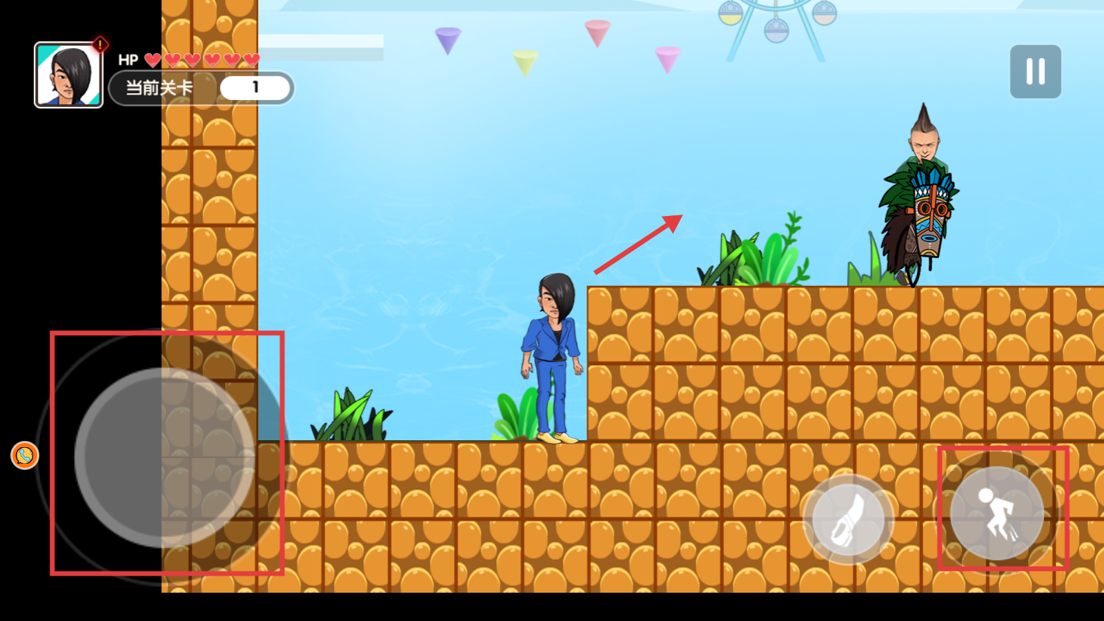 3、遇到障碍时,像图中的石块,点击跳跃键翻越,注意躲避陷阱,保持血量,挑战敌人呢。