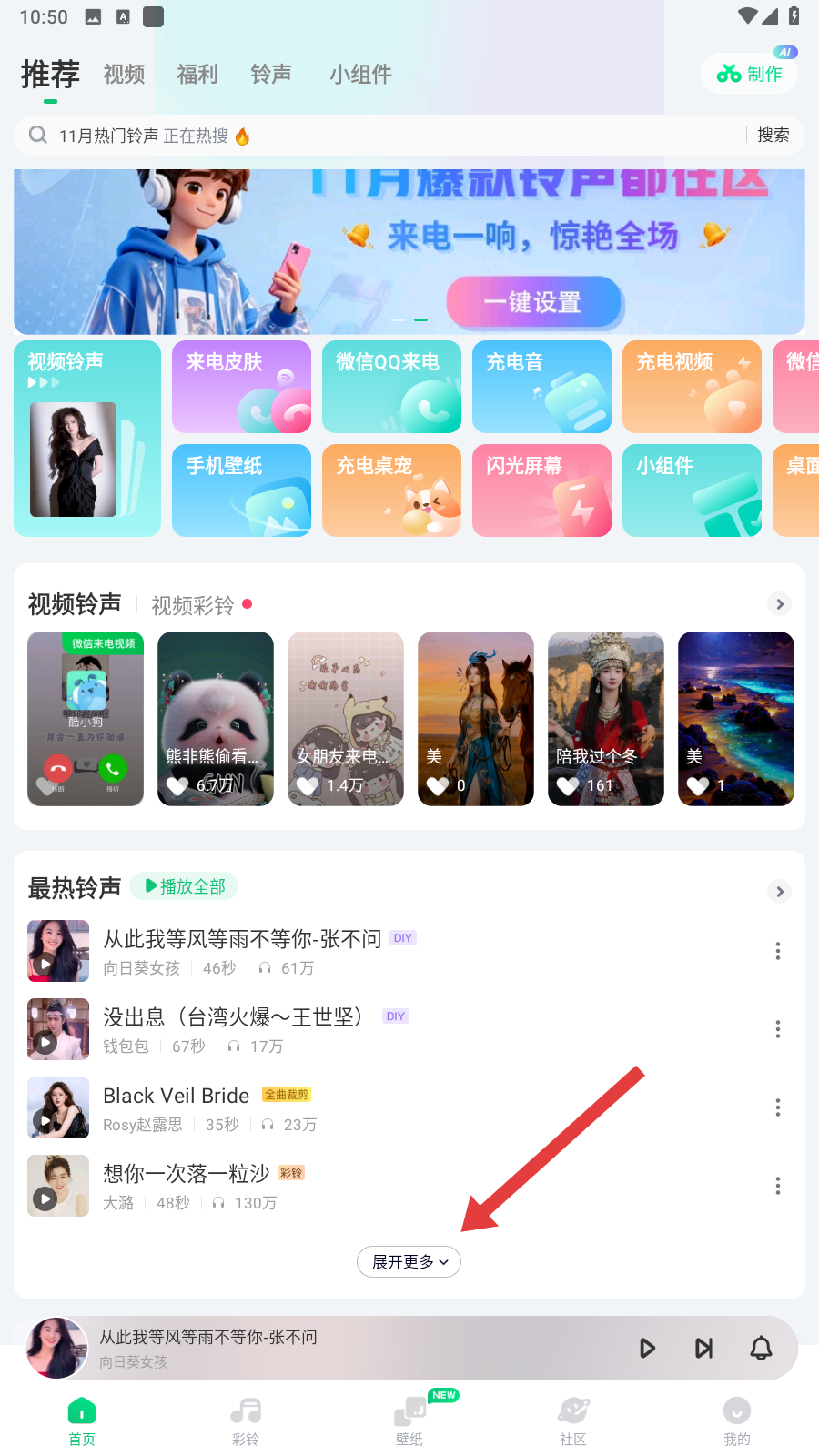 1、我们打开酷狗铃声,在首页点击【展开更多】,就能看到更多铃声选项啦。