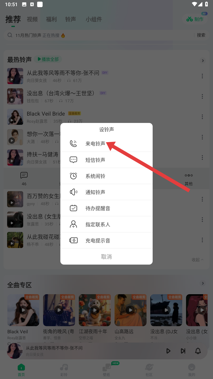 4、最后选择【来电铃声】,就能完成来电铃声的设置,让来电更具个性啦。