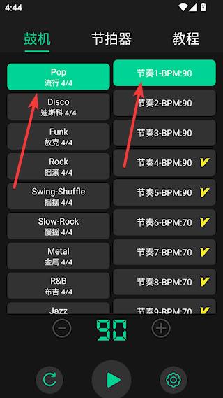 1、下载安装后进入鼓机APP,左边是不同的音乐类型,右边是不同的节奏