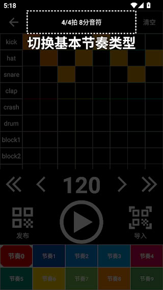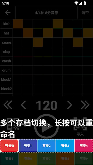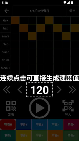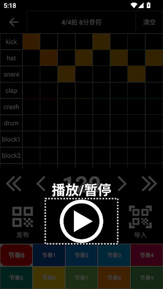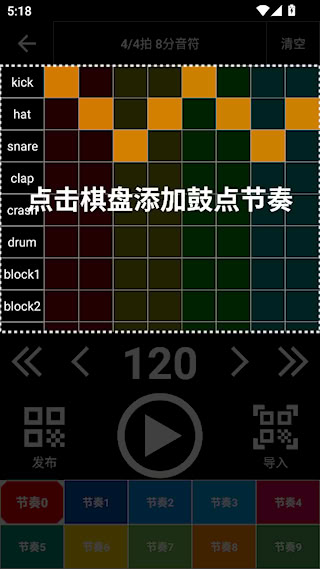 1、支持新建整曲节奏,通过点击网格添加鼓点音符,实现按顺序或循环播放。