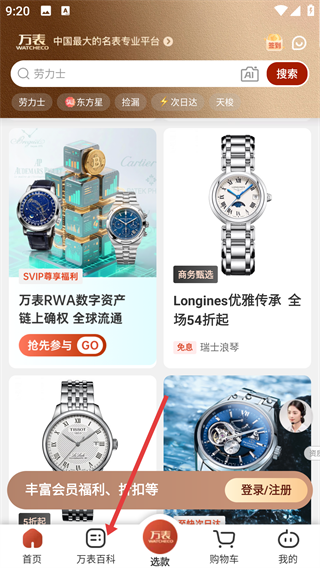 1、打开【万表名表珠宝】软件,我们可以点击底部【万表百科】,进入名表知识与品牌资讯板块呢。