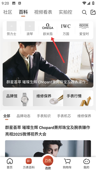 2、在【万表百科】里,我们点击【欧米茄-OMEGA】,查看其品牌动态、系列等信息呀。