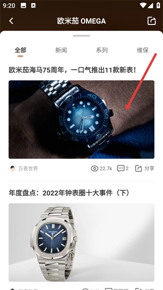 3、进入品牌页面后,我们可以浏览各类资讯,点击感兴趣的文章,深入了解腕表详情哦。