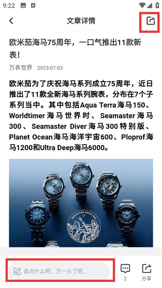 4、在文章详情页,我们可以将内容分享给他人,也能和其他表友互动交流,畅享名表交流乐趣啦。