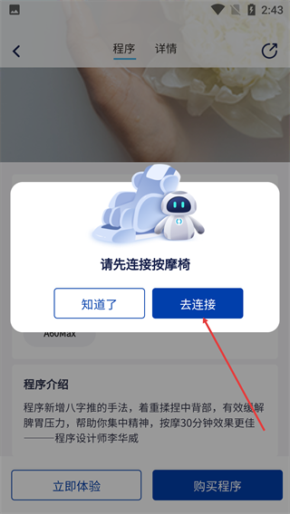 4、点击“去连接”按钮,跳转至按摩椅设备的连接操作流程,以便后续体验功能。