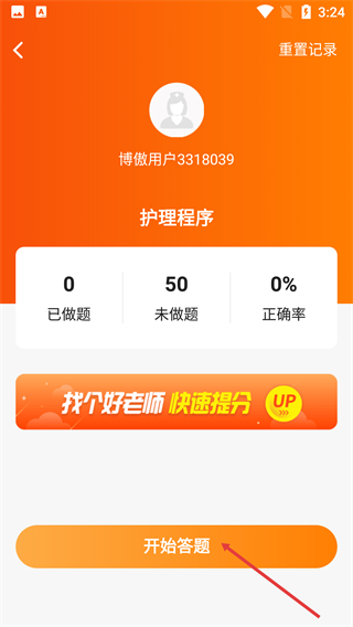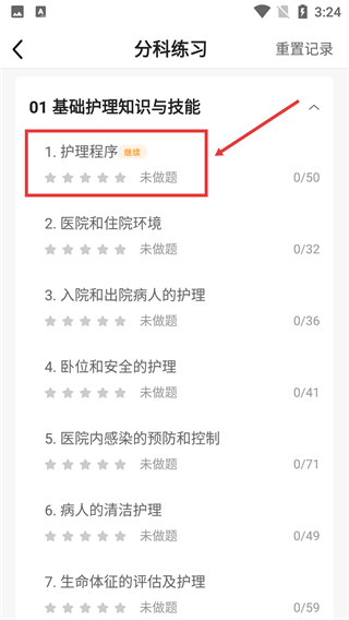 3、进入【护理程序】板块后,点击【开始答题】即可进入习题练习。