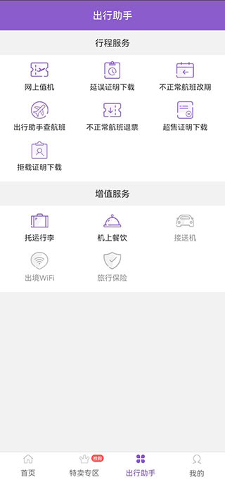 4、进入出行助手,提供航班查询、改期、退票服务,还有托运行李、机上餐饮等增值选项。