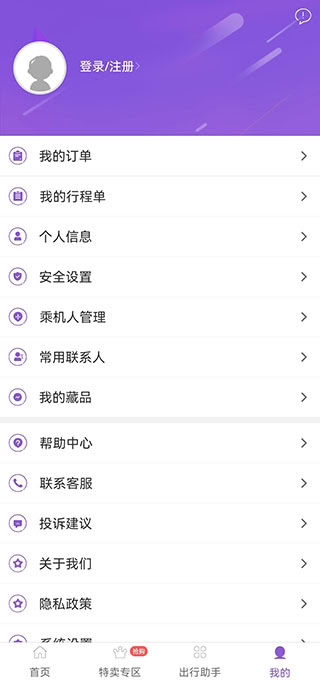 5、点击“我的”进入个人中心,可查看订单、行程及个人信息设置。