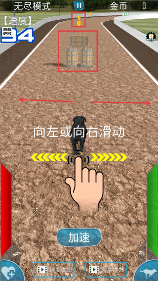 2、在跑酷进程中,遇到木桶障碍,左右滑动屏幕,让狗狗灵活躲避,别忘了吃路上的金币哟。