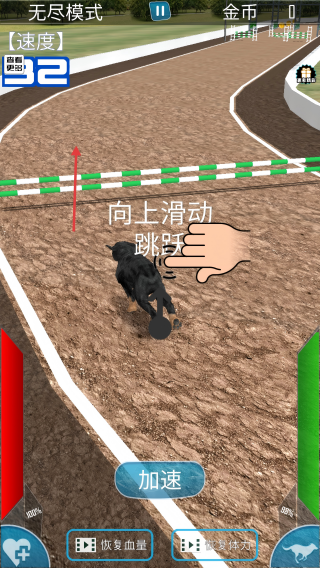 3、碰到跨栏时,向上滑动屏幕,让狗狗跳跃通过,保持节奏,继续往前冲啦。