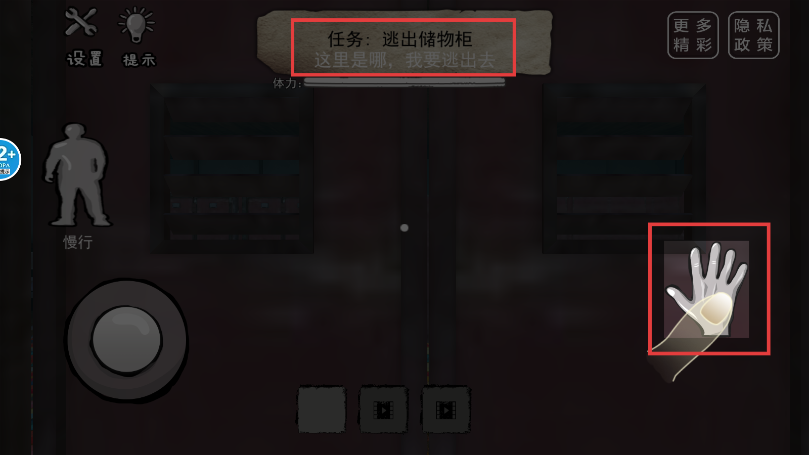 1、进入游戏后,我们被困在储物柜里,先点击右侧手掌按键,尝试推开柜门,开启逃生第一步呀。
