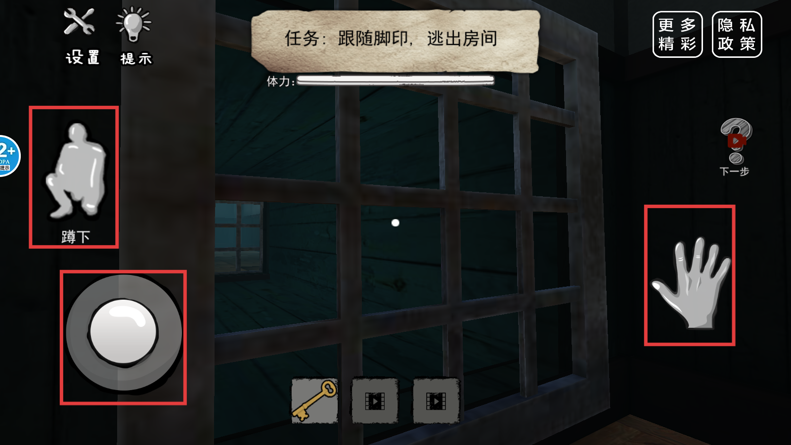 4、到房间的逃生通道处,点击左侧按键蹲下,配合摇杆和右侧手掌按键,用钥匙开门逃出,躲避猛鬼完成挑战啦。