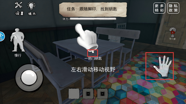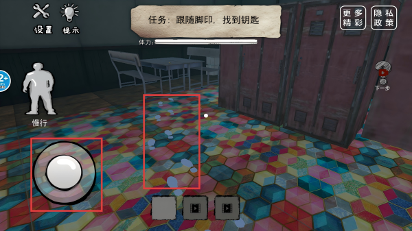2、出储物柜后,用左侧摇杆控制移动,跟随地上脚印找钥匙,别被猛鬼发现哟。