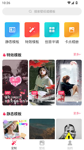 4、DIY个性定制工具:提供各类创意美化模板,可挑选静态或动态壁纸模板,添加个性元素,如悬浮粒子特效,一键定制专属壁纸。