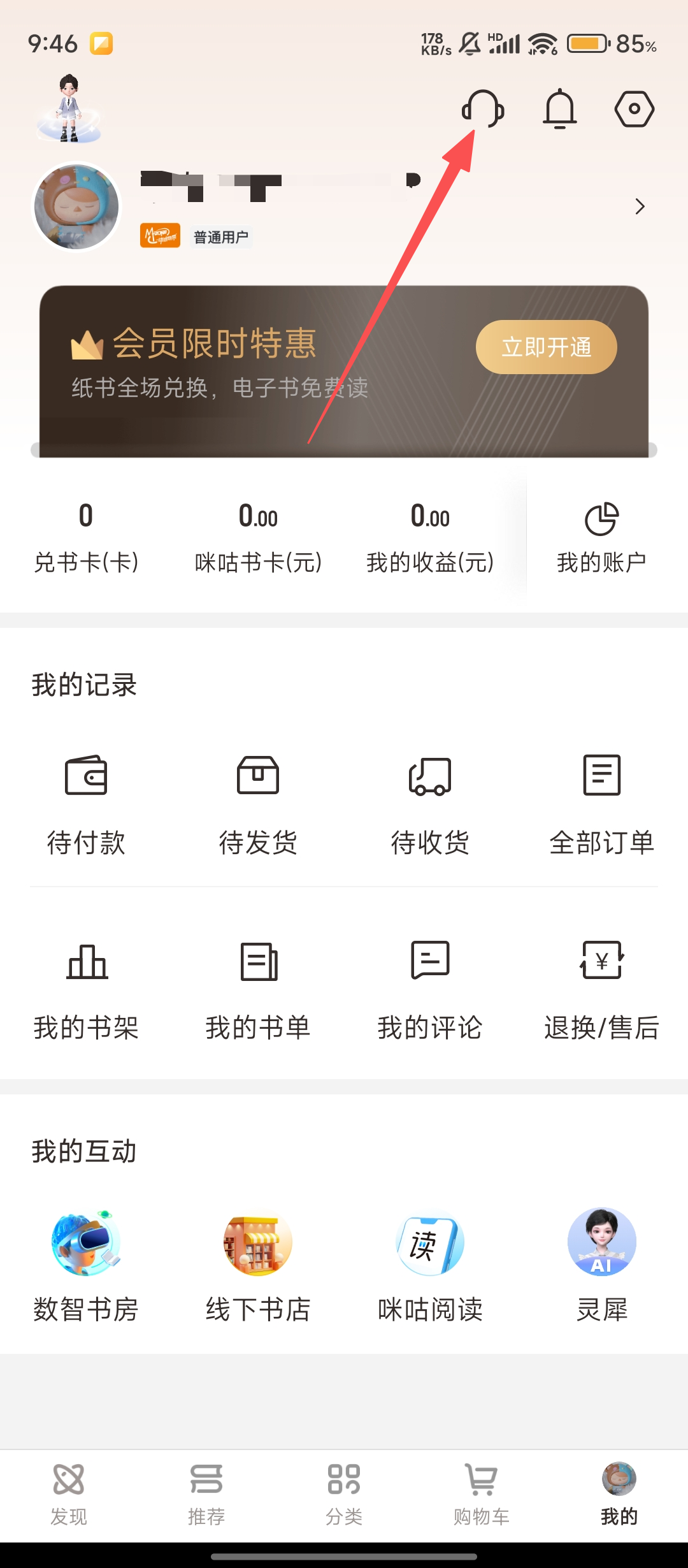 2、进入【我的】页面后,找到顶部耳机样式的客服图标,点击它就能进入服务界面啦。
