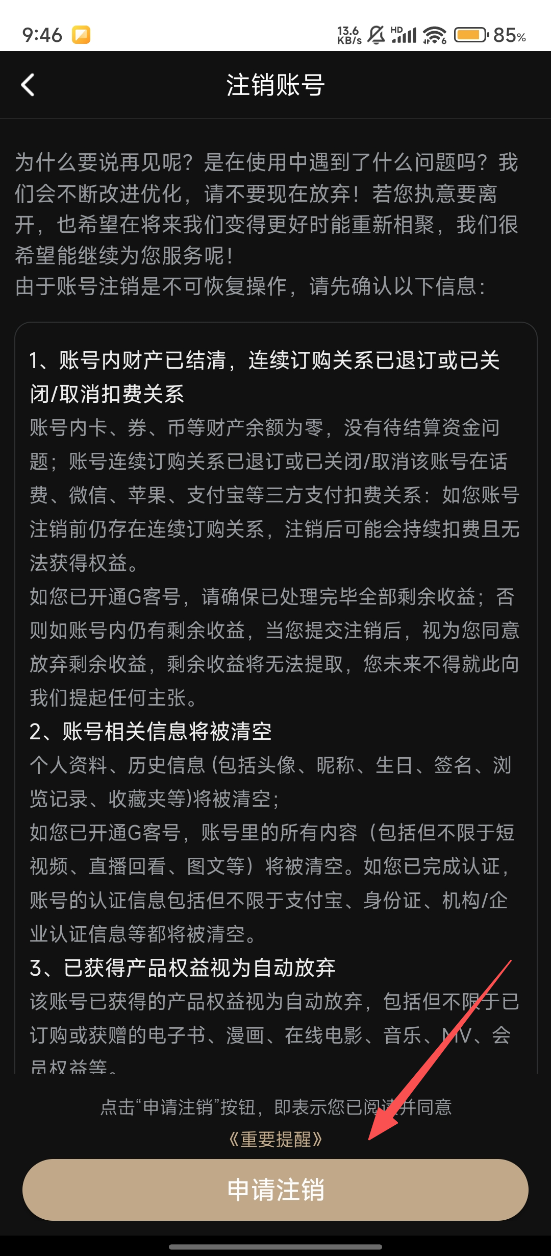 4、仔细阅读注销账号的各项说明,确认无误后,点击【申请注销】按钮,就能完成账号注销操作啦。