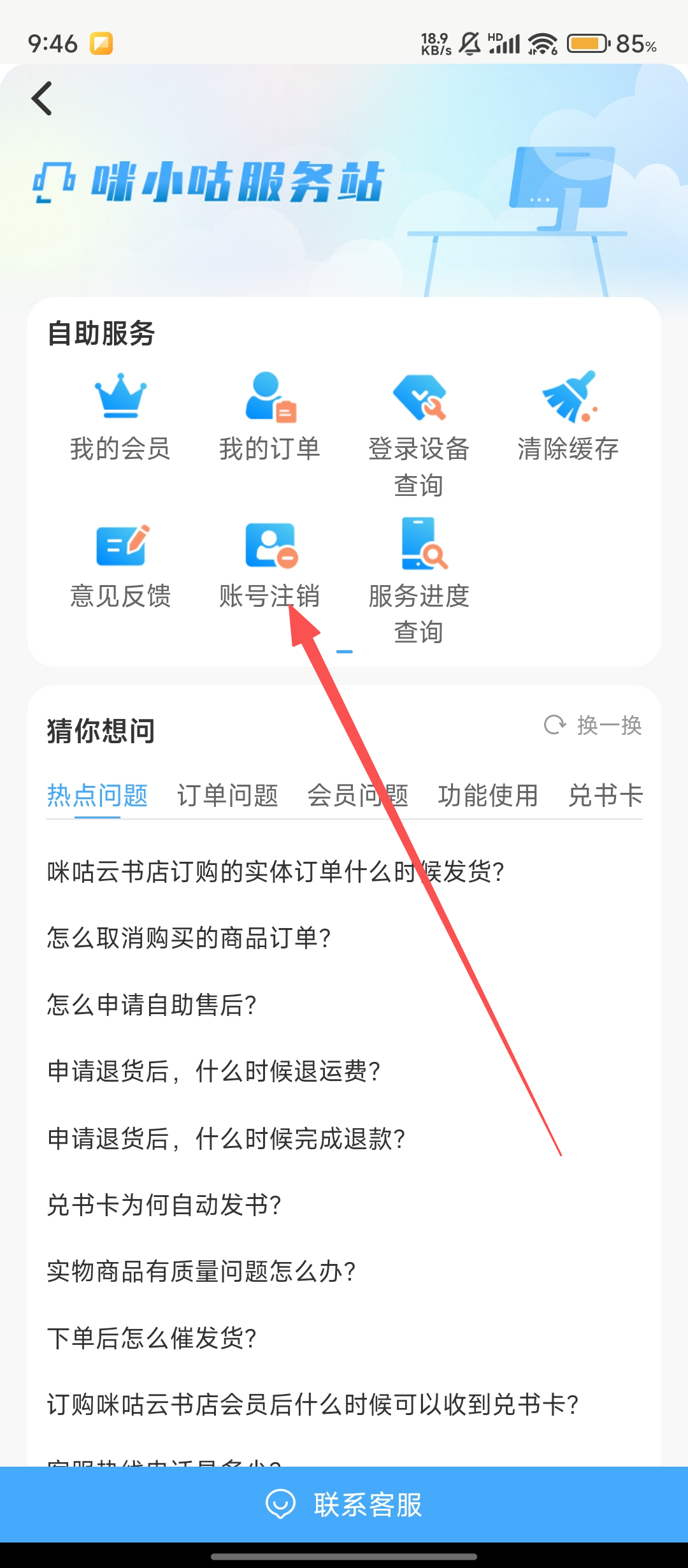 3、在【咪小咕服务站】里,找到【账号注销】选项,点击后就能看到注销的相关说明啦。
