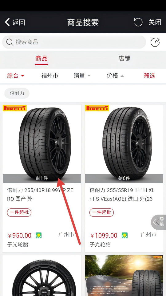 3、在轮胎商品搜索页面,点击目标轮胎商品,可进入该商品详情页。