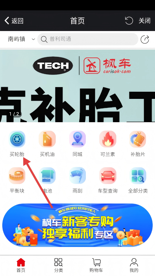 2、在配件采购页面点击【买轮胎】选项,可进入轮胎商品搜索页面。