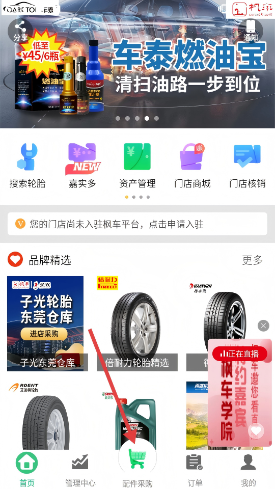 1、在首页点击底部【配件采购】按钮,可进入配件采购页面。