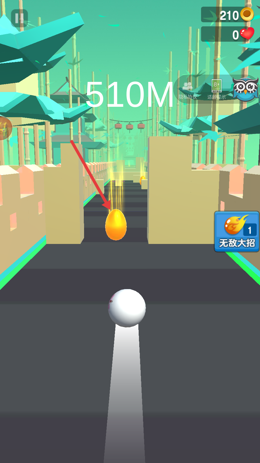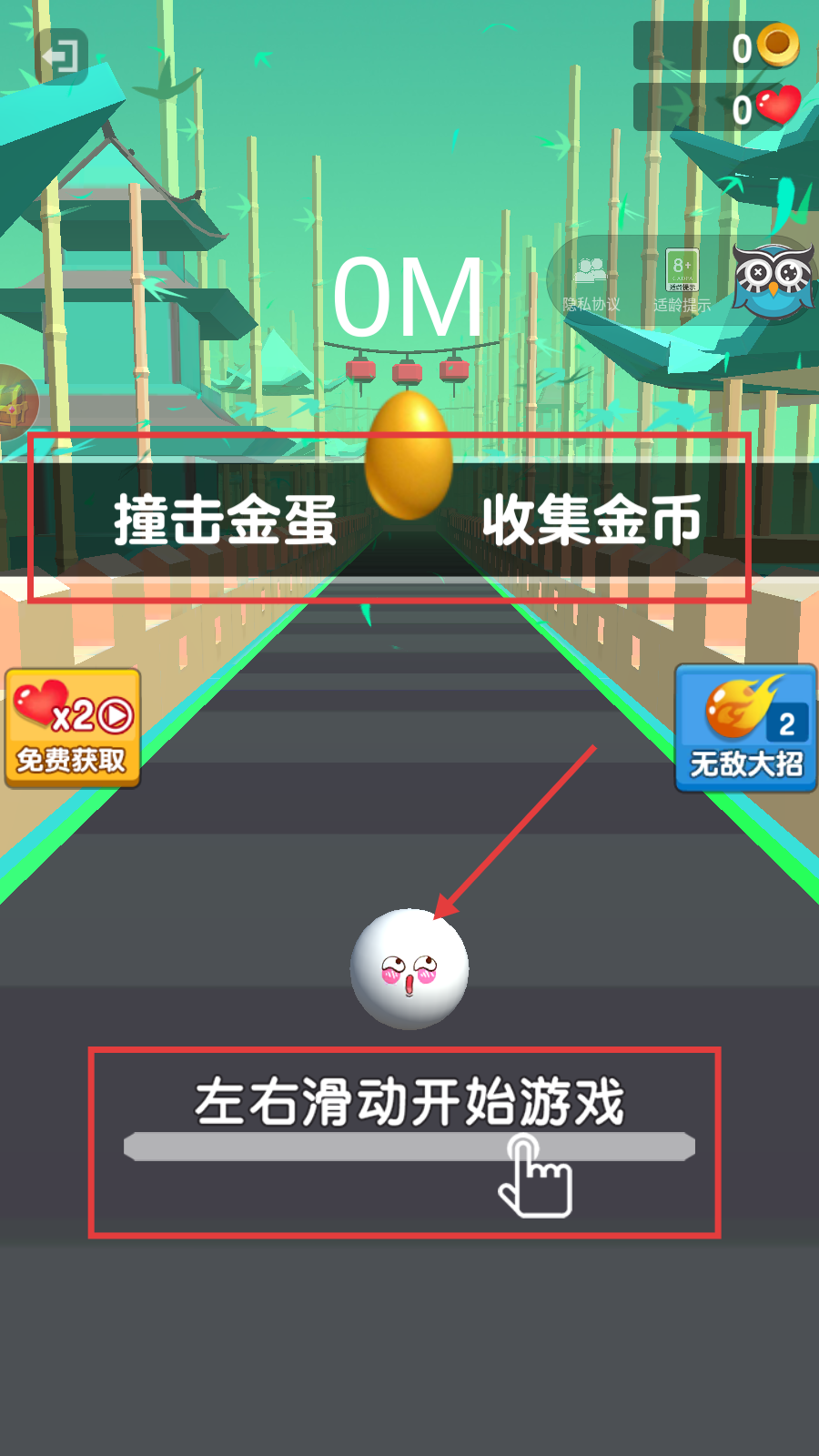 3、左右滑动屏幕,控制球球移动,撞击金蛋、收集金币。