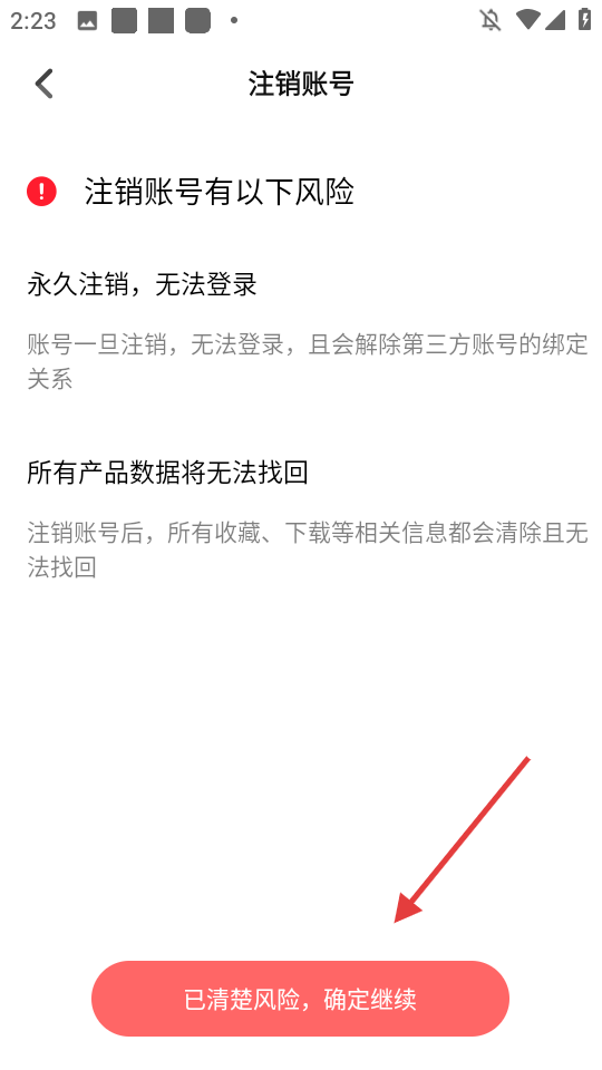 4、点击【已清楚风险,确定继续】,完成账号注销操作。