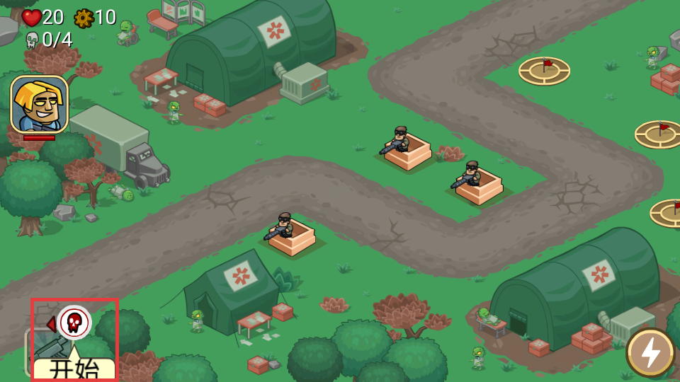 3、布置好防御后,点击左下角【开始】,触发僵尸进攻。