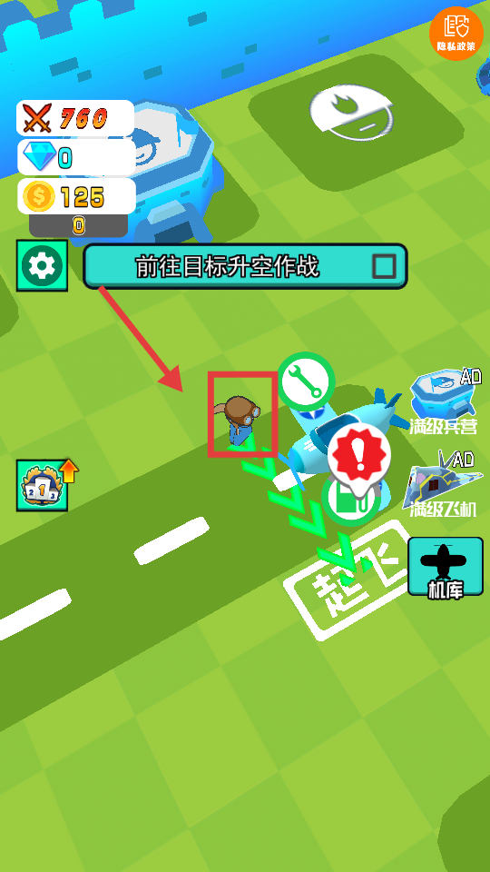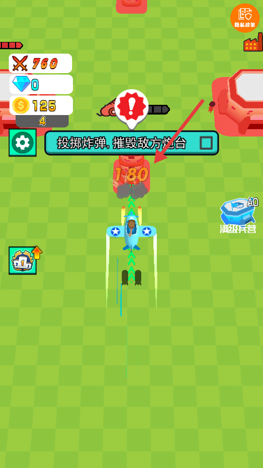 3、驾驶飞机,按指引“前往目标升空作战”,执行投弹任务(摧毁炮台)。