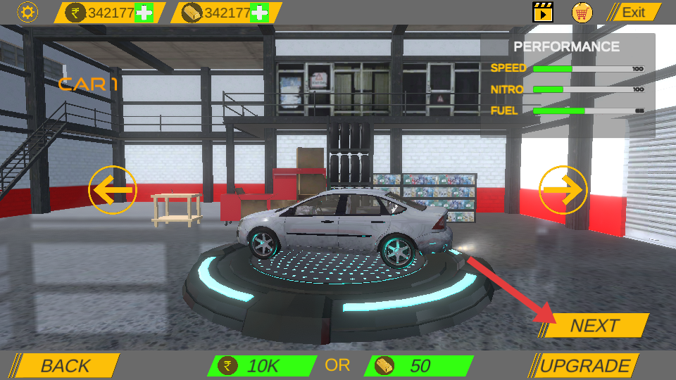 2、在车库界面,点击【NEXT】,选择参赛车辆。