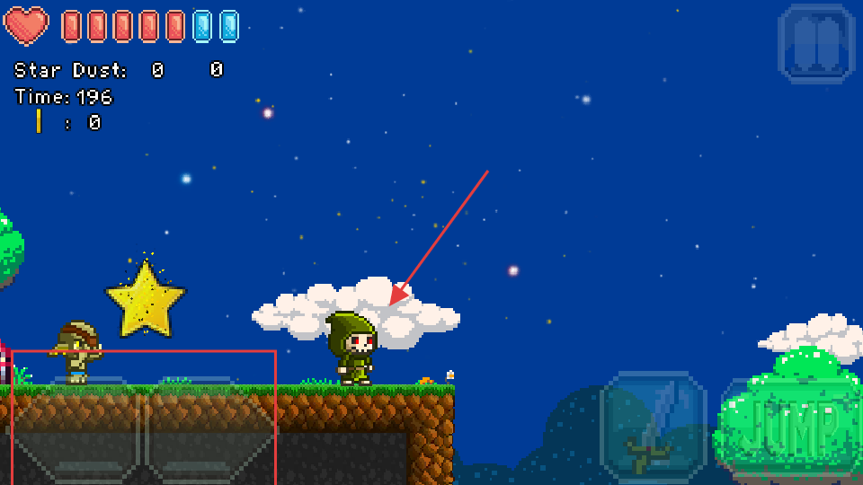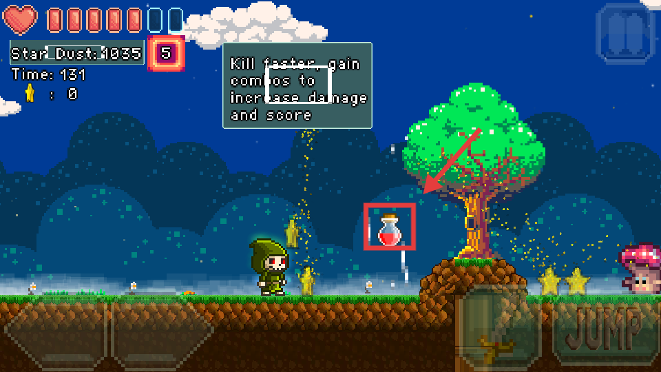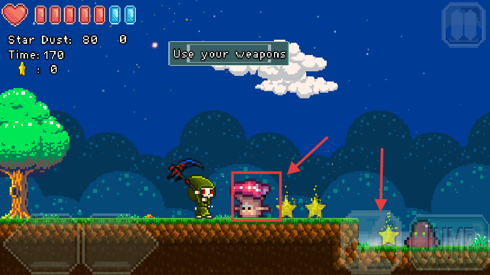 3、碰到红框内蘑菇等敌人,按提示用武器攻击,获取星星尘埃,继续前进。