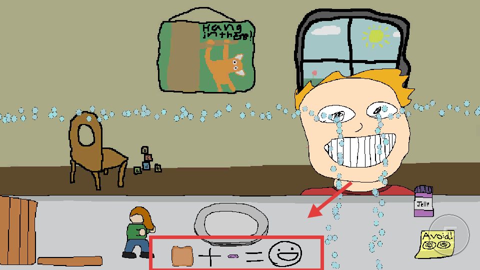 4、进入下一关、按红框内公式(如面包+道具=笑脸),组合物品推进剧情。