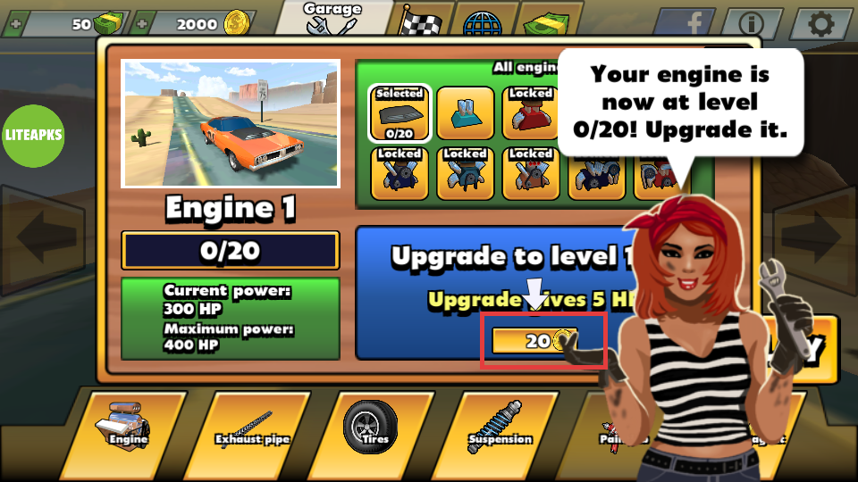 1、在车库点击20金币按钮,升级发动机提升动力。