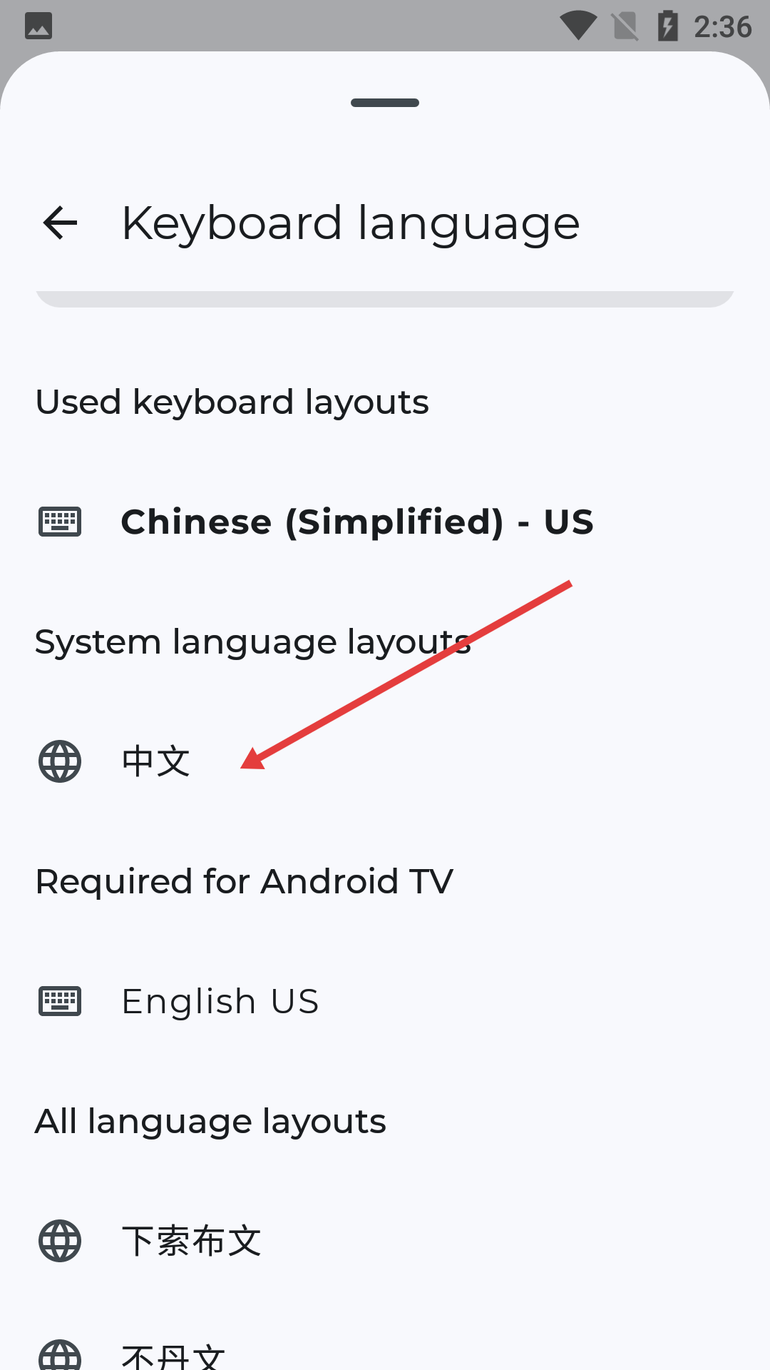 4、在语言设置页面选择【中文】,即可完成键盘语言设置。