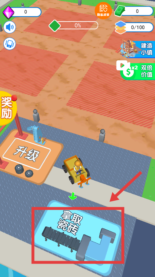 3、驾驶车辆到【拿取瓷砖】区域,获取建造材料。