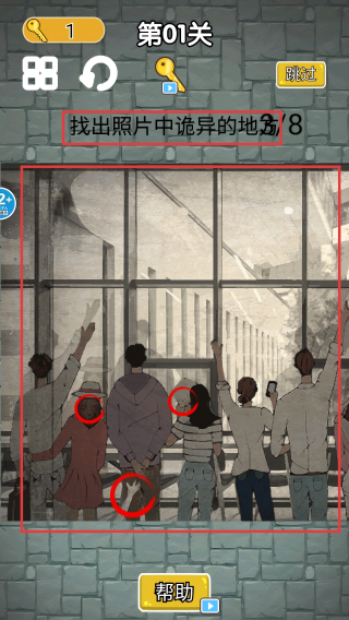 2、在第1关里,仔细观察照片,找出人物异常、多余肢体等【8处诡异地方】,点击完成标记通关。