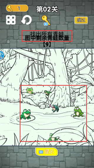 3、到第2关时,认真搜寻画面,找出所有青蛙,并逐个点击收集完成任务,考验你眼力的时候到啦。