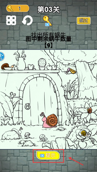 4、第3关找蜗牛,若遇到困难,可以点击【提示】按钮获取线索,帮我们找出隐藏的蜗牛通关。