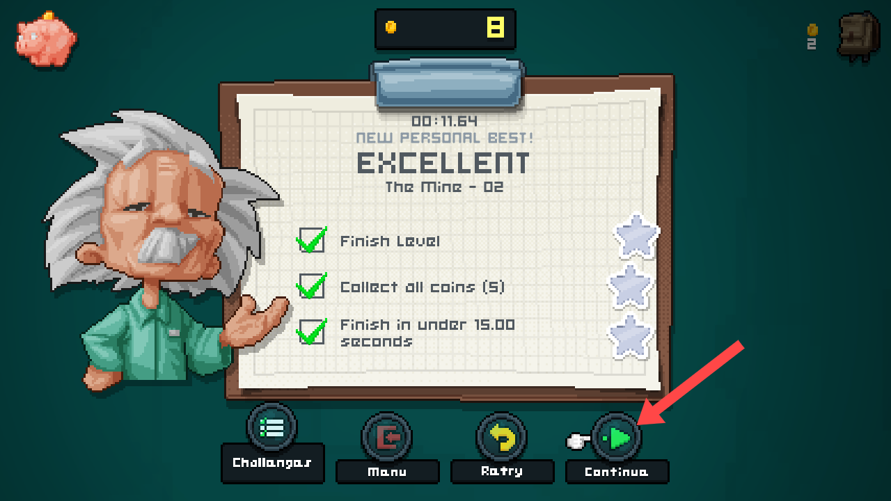 4、完成关卡目标后,在结算界面点击箭头所指的“Continue”按钮,进入下一关继续游戏。