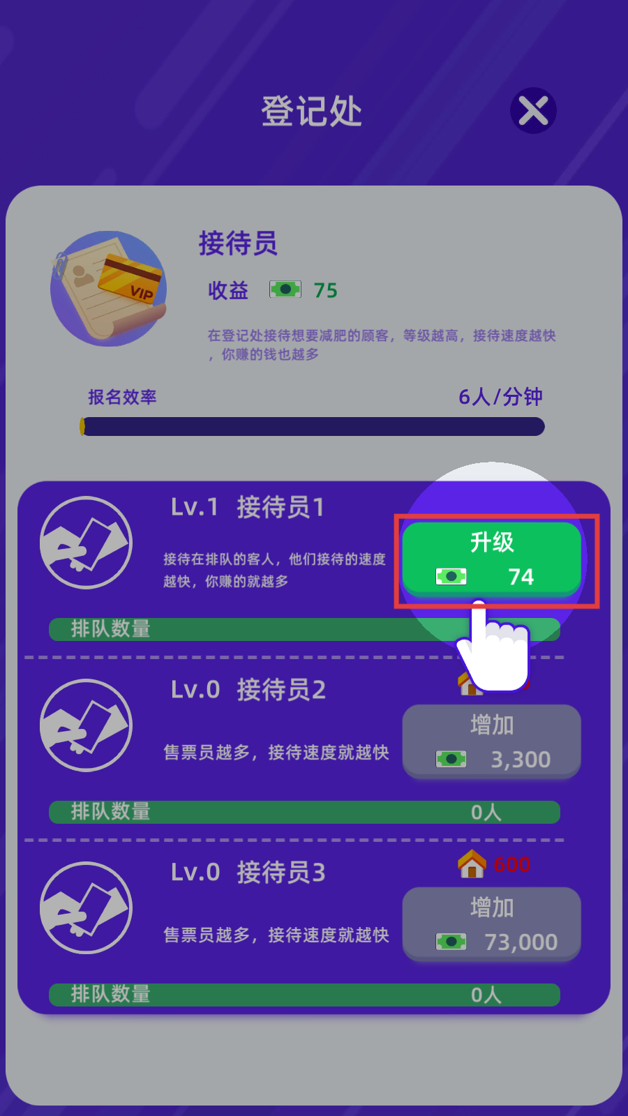 2、进入登记处界面,点击【接待员1】旁的【升级】按钮,提升接待员效率哟。